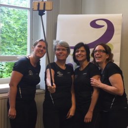 Daar sta ik, in 't midden, de 5e van links. Je ziet het zo niet aan mij. Mijn rug en liezen zijn flink geblesseerd na jarenlang toptraining aan het Koninklijk Conservatorium in Den Haag. Eerlijk gezegd kwam het door mezelf. Ik had al een slechte rug, maar ik wilde persé naar die school in Den Haag! Jarenlang daarna liep ik van arts naar Ziekenhuis totdat ik wist hoe ik het zèlf kon voorkomen om in een rolstoel te belanden en toch een leuk leven te hebben! Dus ik ging aan de slag!
